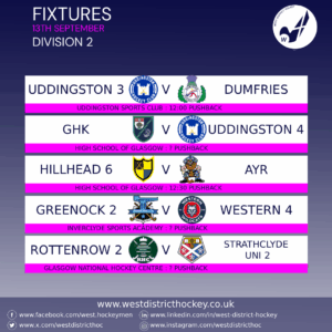 GHK will be hoping to maintain their strong start in division two from last week, as they welcome Uddingston 4th XI to Glasgow. Meanwhile, Dumfries face a trip to Uddingston 3rd XI as they play the recently relegated side. Founded as an alumni club of Strathclyde University, Rottenrow 2nd XI will face their ‘younger brothers’ in Strathclyde University 2nd XI’s first match of the season at the National Hockey Centre. Ayr will hoping to put last weeks poor performance behind them, as they take on newly promoted Hillhead 6th XI. The other match see’s Greenock 2nd XI host Western 4th XI at the new Inverclyde Academy pitch.