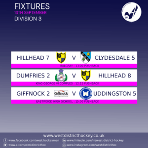 Only the three matches in division four as two sides hoping for promotion clash at Balgray. Hillhead 7th XI and Clydesdale 5th XI both had strong opening matches and will relish the fight on the pitch on Saturday. Dumfries 2nd XI will host Hillhead 8th XI in a match that should show off the best of the young West District players. Uddingston 5th XI travel to play Giffnock 2nd XI.