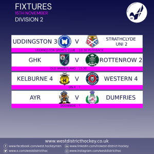Only the four matches in division two this weekend, with the biggest fixture coming from Old Anniesland. GHK will be hosting Rottenrow 2nd XI with both sides pushing for promotion this season. Rottenrow remain unbeaten so far, but GHK will be no pushovers. They start at 12:30. The other promotion contender is Uddingston 3rd XI, who have a home tie against Strathclyde University 2nd XI. The students have struggled for consistency this season and will have their work cut out against Uddingston, who themselves are on a six-match winning run. At the other end of the table, Kelburne 4th XI will fancy their chances at the first points of the season as they take on Western 4th XI at ON-X. Neither side have picked up many points this season, but Saturday could be a good chance. The other match see’s Ayr host Dumfries.