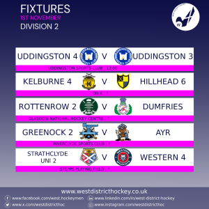 It’s a big clash in division two, as Uddingston 4th XI host Uddingston 3rd XI. The intra-club derby is set to be a good one as both sides are in good form, sitting in third and second respectively. Rottenrow 2nd XI sit top of the division and will be hosting Dumfries at Glasgow National Hockey Centre. The Glasgow side remain unbeaten in their opening five games. Kelburne 4th XI have had a tough start to the season, remaining winless in their first three games. They will be hoping to change their fortunes this weekend as they host Hillhead 6th XI. Elsewhere, Greenock 2nd XI play Ayr, at Inverclyde, whilst Strathclyde University 2nd XI host Western 4th XI.