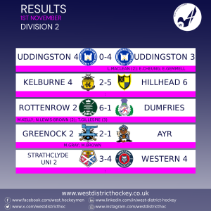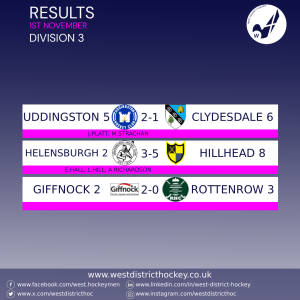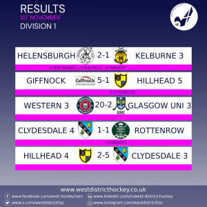 It was a massive win for Western 3rd XI in division one this weekend. They demolished Glasgow University 3rd XI twenty goals to two. The students struggled to get enough players and perhaps were spooked a little from the previous evening’s antics. A scary result that goes in the record books as one of the biggest in West District history. An excellent result for Clydesdale 4th XI saw them draw with Rottenrow. The first point on the board for the promoted side allowed their Clydesdale counterparts to catch up with ‘row in the league table, after their 5-2 win over Hillhead 4th XI. The two sides sit second and third and are separated by goal difference only. Elsewhere, Giffnock had a comfortable victory over Hillhead 5th XI and Helensburgh won late on, with a Jamie Caulfield goal, to take all three points from Kelburne 3rd XI.