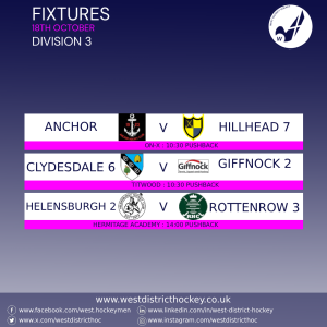 Three games in division three this week, with new starts Rottenrow 3rd XI back in action, after an impressive first match last week. They travel down to Hermitage Academy to face Helensburgh 2nd XI with both sides on equal points. Clydesdale 6th XI will be keen for their first win as they host Giffnock 2nd XI, whilst Anchor will continue there look for promotion as they welcome Hillhead 7th XI to the ON-X.