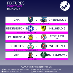 Rottenrow 2nd XI have been the surprise package at the start of this division two and sit at the top of the pile. They travel to Ayr on Saturday, who are winless so far this season. Rottenrow will be hoping to take all three points back to Glasgow and maintain top spot in division two. GHK are back in action after defeat last time out, a couple of weeks ago. They will be looking to get back on track with a win against Greenock 2nd XI, who travel to Old Anniesland. Uddingston 3rd XI will be keen to keep their unbeaten start going, with a match against Hillhead 6th XI. Elsewhere, Kelburne 4th XI host Strathclyde University 2nd XI and Western 4th XI travel down to Dumfries.