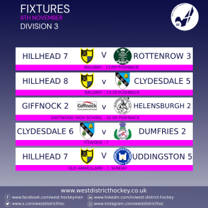 A full fixture card in division three see’s challengers Clydesdale 5th XI back in action. They haven’t played since mid-October and will be wanting to continue their unbeaten start with a win over Hillhead 8th XI. Currently holding top spot is Uddingston 5th XI, and they play on Sunday against Hillhead 7th XI. It could be a tough weekend for Hillhead, as they play Saturday as well, hosting Rottenrow 3rd XI, who will be looking to get back to winning ways after their first loss of the season last week. Helensburgh 2nd XI travel to Giffnock 2nd XI in what should be a competitive match. And the final game see’s Clydesdale 6th XI welcome Dumfries 2nd XI to Titwood.